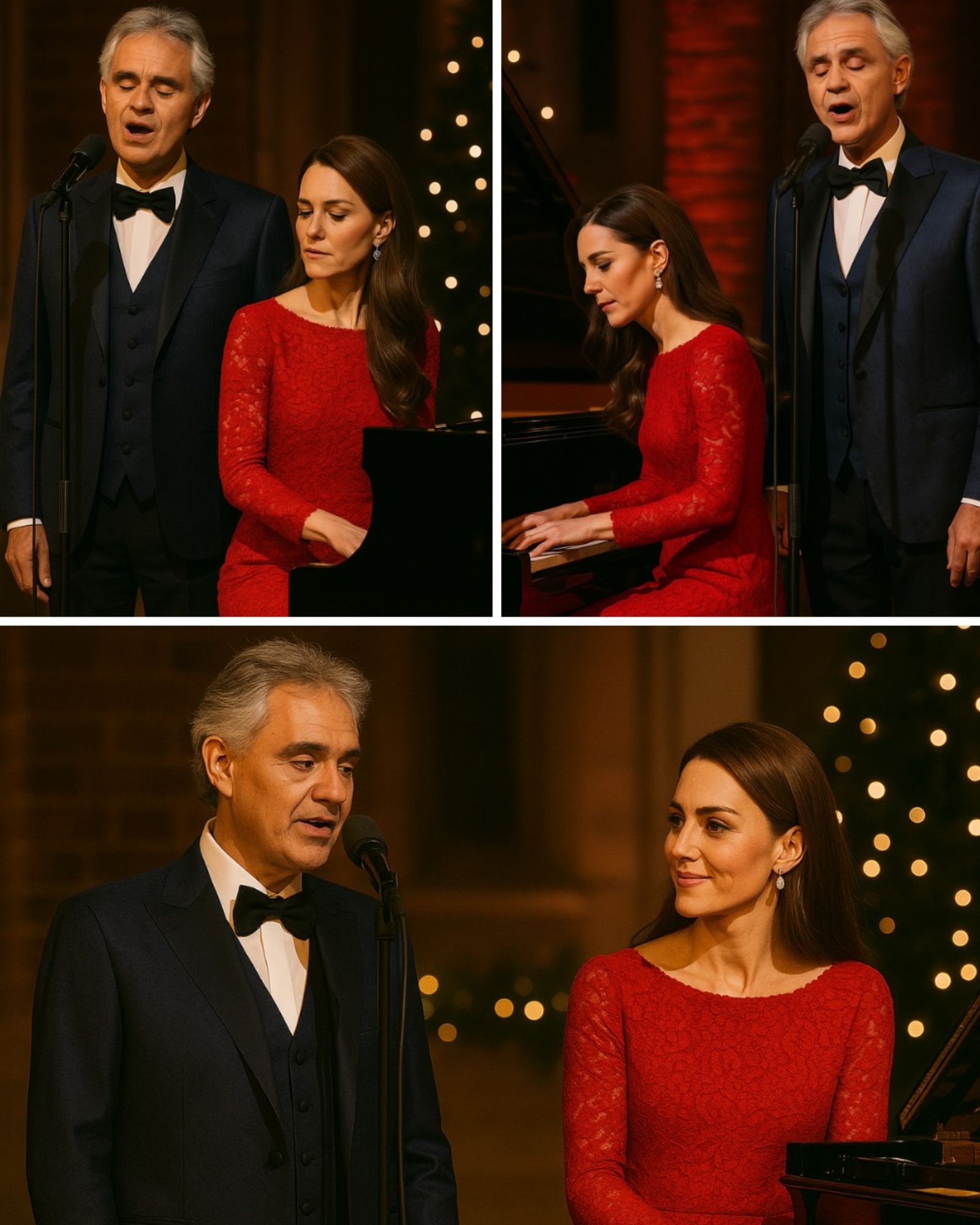Then Andrea Bocelli stepped forward. His voice — rich, timeless, and filled with soul — carried Ave Maria into the heavens. The harmony between Kate’s delicate touch and Bocelli’s soaring tone felt almost divine. For a few breathless minutes, there were no titles, no roles, no barriers — only two hearts speaking the universal language of grace.
