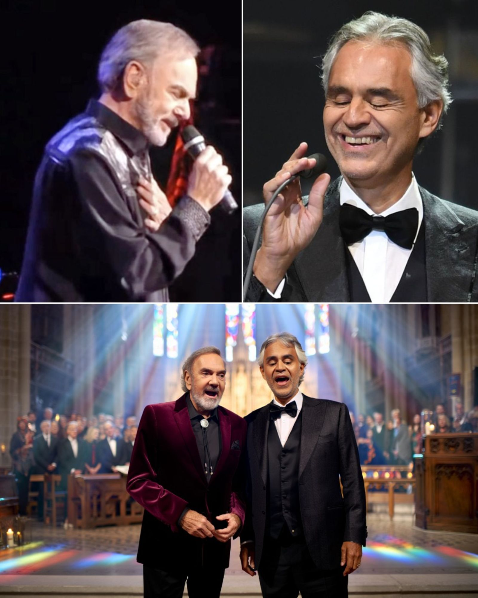 It was a night that will never be forgotten — a performance that transcended the boundaries of concert and became something far more profound. Inside a towering gothic cathedral, its stained-glass windows scattering beams of blue, red, and gold across polished marble floors, Andrea Bocelli and Neil Diamond stood together at the altar. The air was thick with silence, until it was broken by the first swell of their voices rising in perfect harmony.