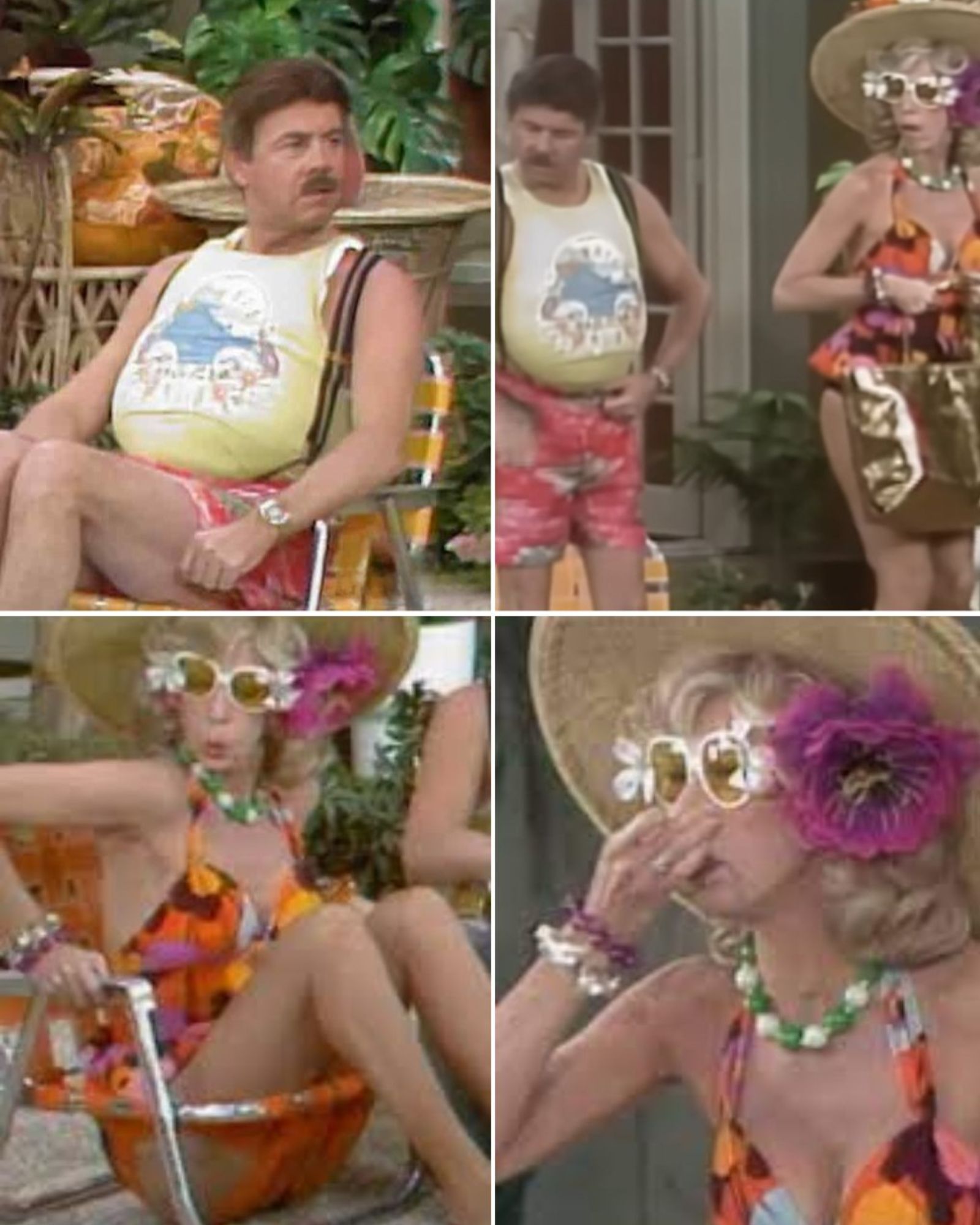 Carol Burnett, wearing a loud floral swimsuit and a gloriously oversized sunhat, plays the hilariously over-the-top wife. Vicki Lawrence brings perfect deadpan wit as the not-so-innocent secretary. As the two women clash, Harvey’s character is left in stunned silence—clutching his beach towel and any dignity he can muster.