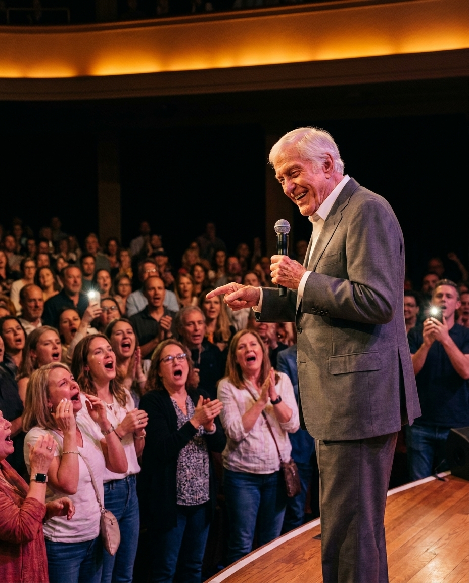 That gesture said more than a long speech could have. It was gratitude, surprise, amusement, and recognition all at once. In that instant, it stopped feeling like a performer forgetting a line. It became a room full of people holding up someone who had spent a lifetime lifting them.