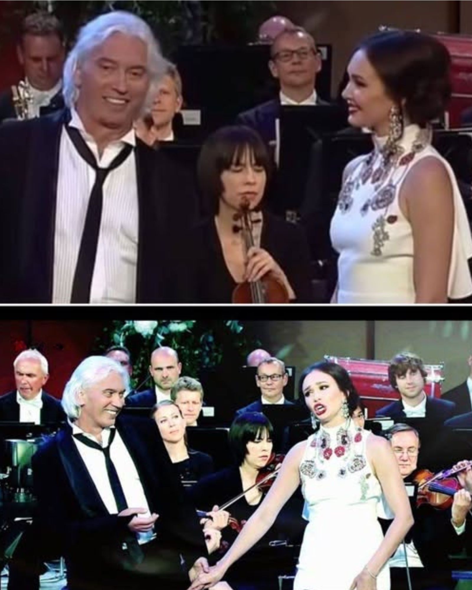 Across from him, Aida Garifullina shone in white satin, her eyes filled with reverence and affection for the man she had admired since childhood. Their voices met tenderly, blending like two rivers — his dark and resonant, hers light and pure.