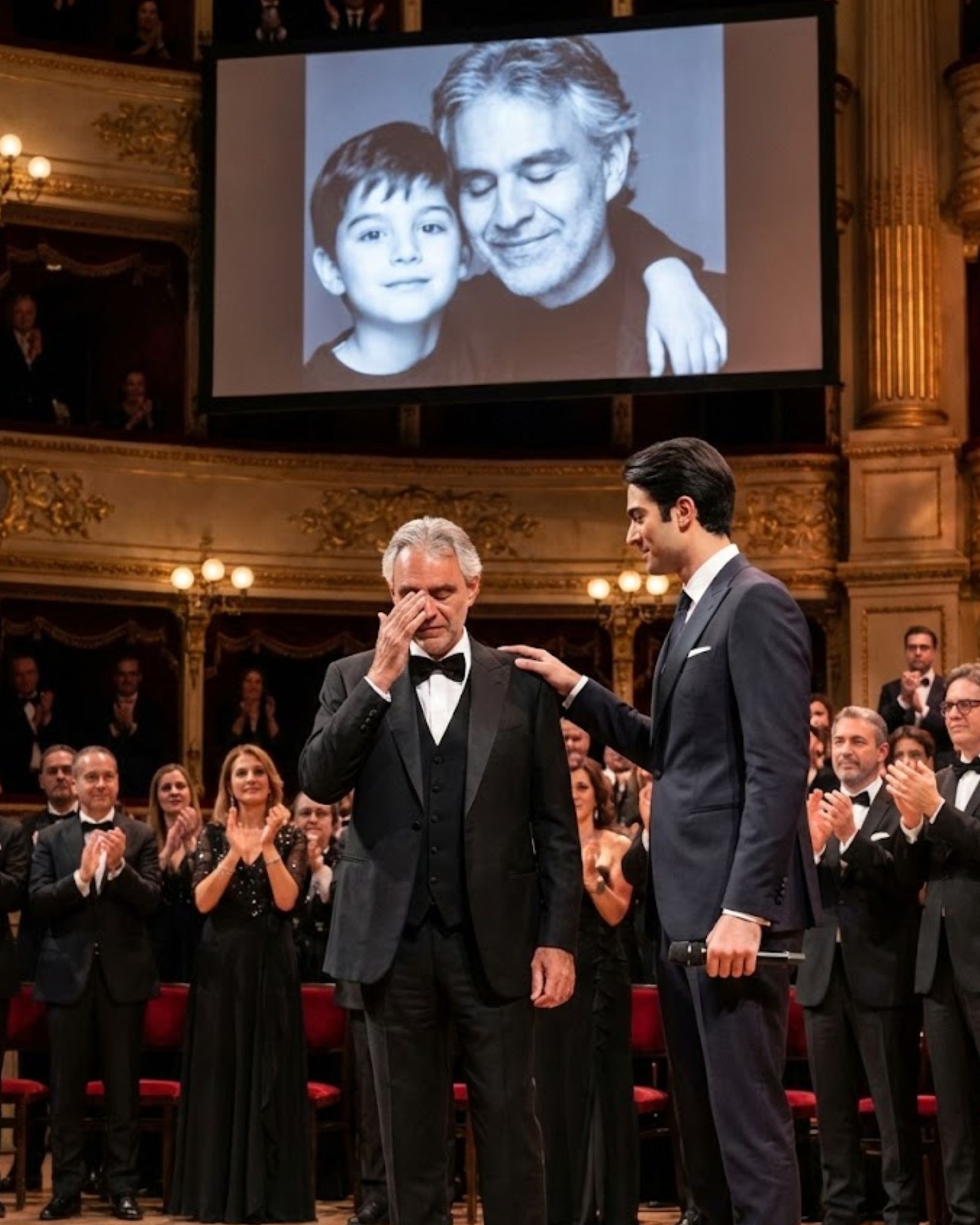 As the familiar orchestral opening filled the space, Andrea Bocelli lowered his head. A soft smile appeared, not for the crowd, but for the voice he recognized better than anyone else. In that moment, Andrea Bocelli was not the global icon who bridged classical music and pop. He was not the man whose voice had carried millions through weddings, funerals, and quiet nights.