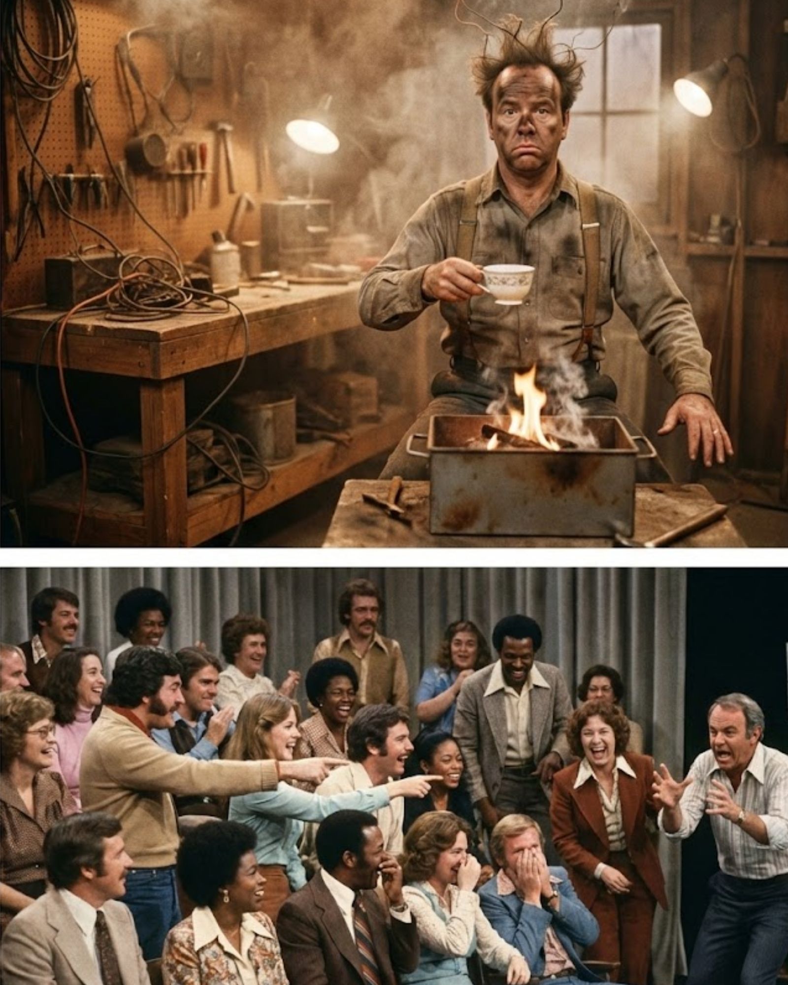 Tim was playing an elderly appliance repairman in a silent sketch. No dialogue. Just physical comedy. The script called for a classic gag: he touches a loose electrical wire, his hair shoots straight up using thin prop wires, and his body launches into a jerky, exaggerated “electrocuted” dance.