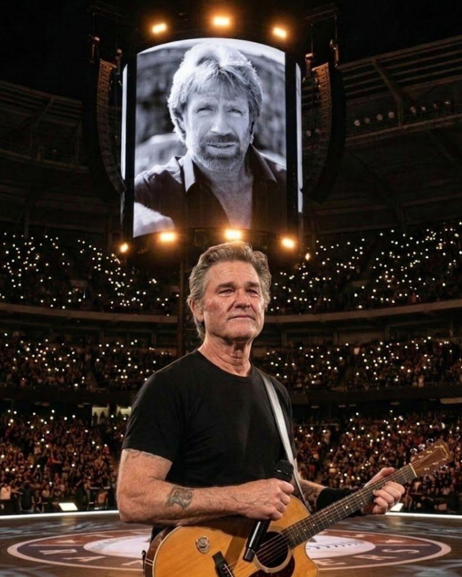 Kurt Russell was not there as a polished entertainer in that moment. Kurt Russell was there as someone carrying memory. That was the difference. The guitar in Kurt Russell’s hands did not make the scene feel like a concert. It made it feel like a late-night conversation that had somehow spilled into a stadium.