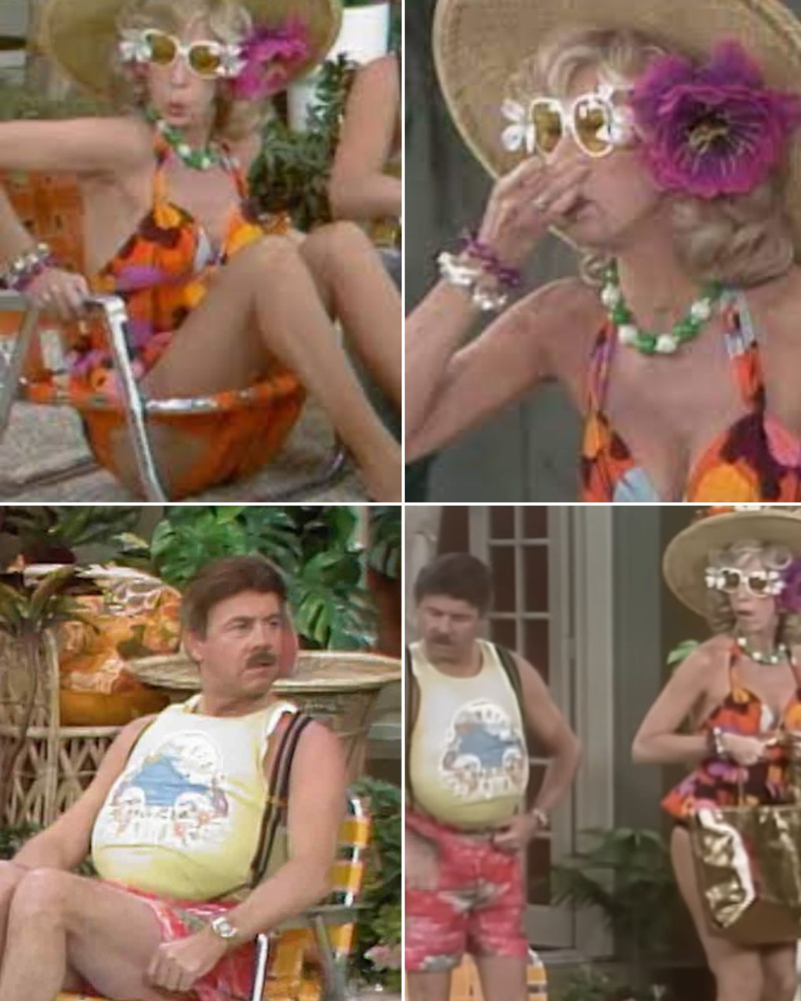 The casting and character execution are what turn this sketch into gold. Carol Burnett, radiating magnificent, barely-contained fury, plays the “not-so-clueless” wife. She’s decked out in a blazing floral swimsuit and a monstrously oversized hat, serving looks that could curdle the Pacific Ocean. Opposite her is Vicki Lawrence, whose brilliant comedic timing allows her to play the secretary — deadpan, mischievous, and deceptively sharp — a woman who is “innocent” only in the most technical, meaningless sense of the word.